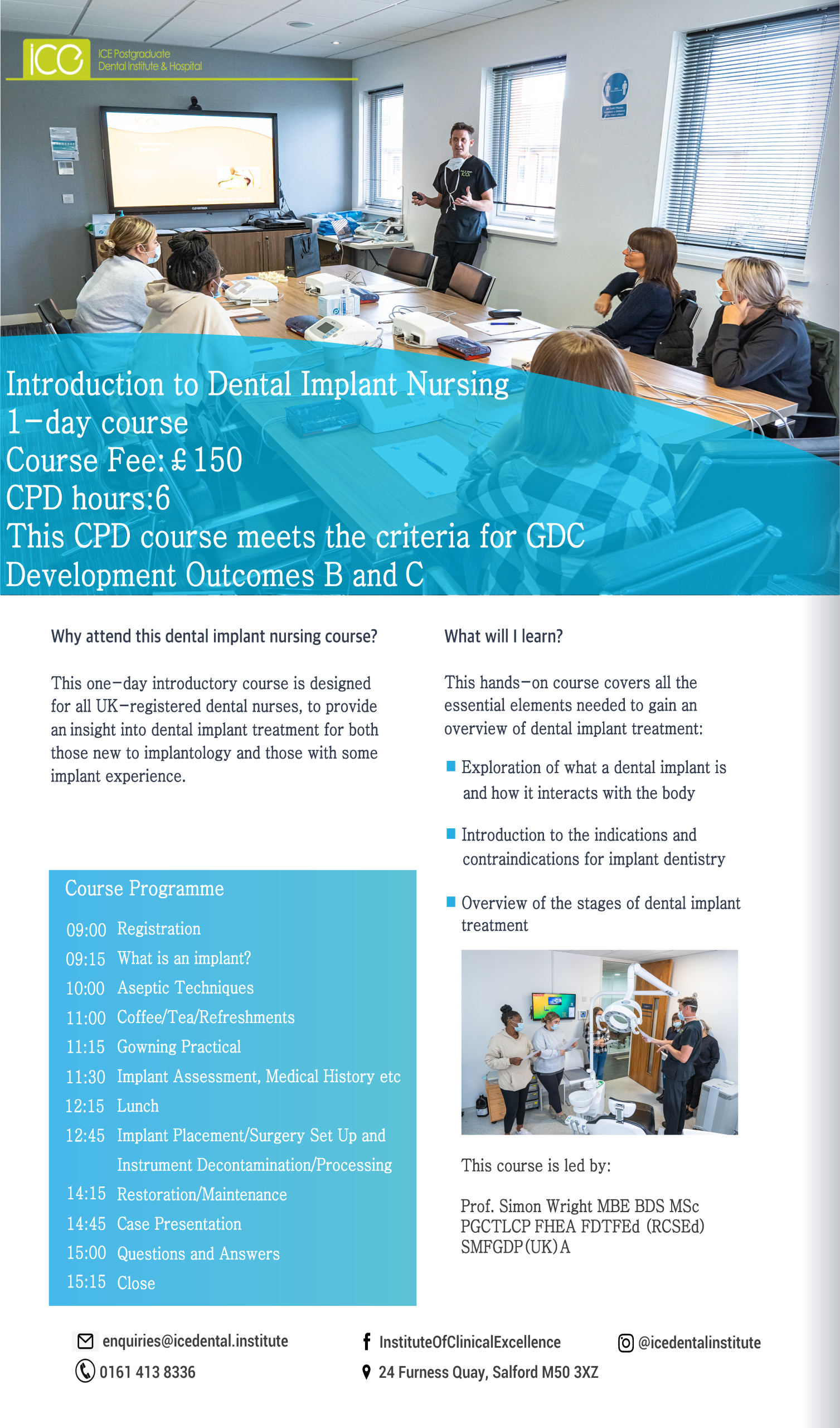 - The introduction to dental implant nursing course is 6 CPD hours.